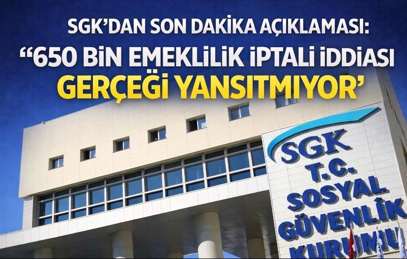 “Son günlerde bazı medya organlarında yer alan ve kamuoyunda endişeye yol açan ‘650 bin kişinin emekliliğinin iptal edildiği’ yönündeki iddialar doğru değildir. Kurumumuz kayıtlarına göre son 5 yılda emekliliği iptal edilen kişi sayısı 12 bin 209’dur.”